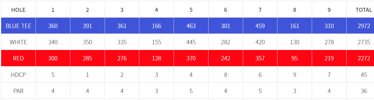 프린세스 cc 파인 코스는 사시사철 변함이 없는 소나무 같은 코스로 9홀, Par 36, 블루티 기준 총 2,972m 전장이에요.