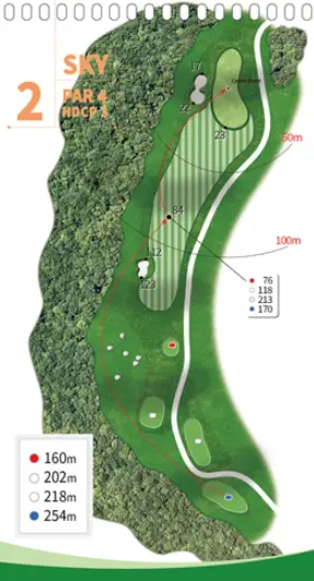 좌측 커다란 해저드와 우측 낭떠러지 경사면 사이 정 중앙 라이트 방향으로 티샷해야 하는 심리적 부담감이 많은 Par 4홀이에요. 그린 앞 전체가 커다란 벙커로 포진된 포대그린으로 높은 탄도의 샷을 구사해야 온 그린이 가능해요.