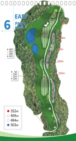 티샷의 방향에 따라 공의 낙하지점 IP 범위가 다르며 폭이 좁고 굴곡이 심한 페어웨이로 세컨샷을 보내려면 정교한 방향성이 요구되는 Par 5홀이에요. 티샷은 좌측 숲과 라이트 중간을 보내야만 중앙에 안착되어요. 그린의 폭은 좁고 길어요.