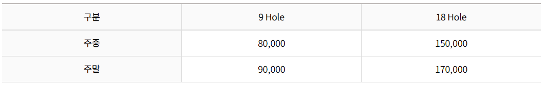 스프링 힐스 CC 그린피는 18홀 기준 주중은 15만 원, 주말은 17만 원이에요.