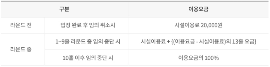 - 이용요금 : 그린피(시설이용료 포함) + 카트비 + 제세공과금