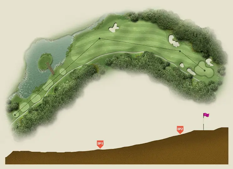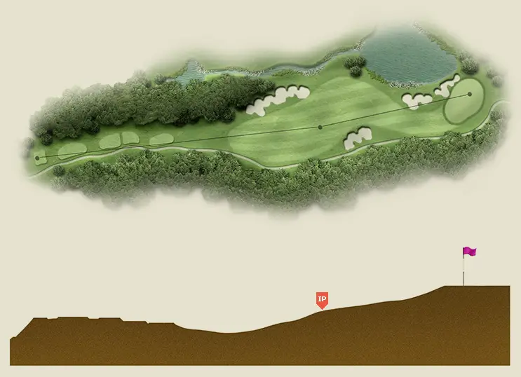 우측으로 굽은 도그렉 Par 5홀로 좌측에 해저드를 주의하고 벙커 우측 끝방향으로 티샷 하는 것이 좋아요. 세컨샷부터는 오르막으로 여유 있는 클럽선택과 넉넉한 거리계산이 필요하며 3단 오르막 그린에 주의해야 해요.