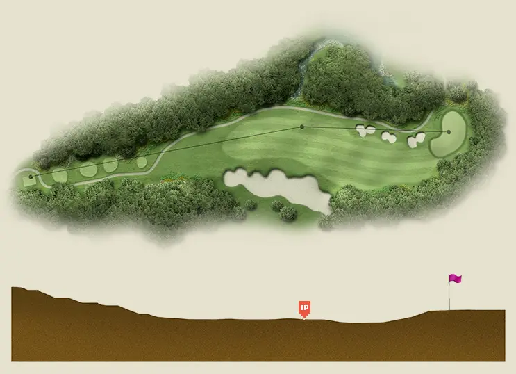 약간 내려치는 홀로 그린이 능선아래 자리 잡고 있어 안정된 느낌을 주는 Par 4홀이에요. 우측 대형벙커를 조심하고 그린 우측 끝 방향으로 티샷 하는 것이 좋아요. 좌측 뒤쪽으로 흐르는 경사가 있는 그린이므로 핀 오른쪽으로 공략하는 것이 좋아요.