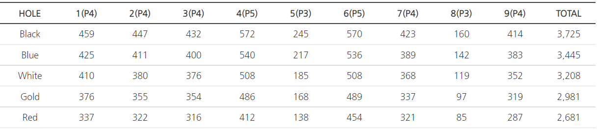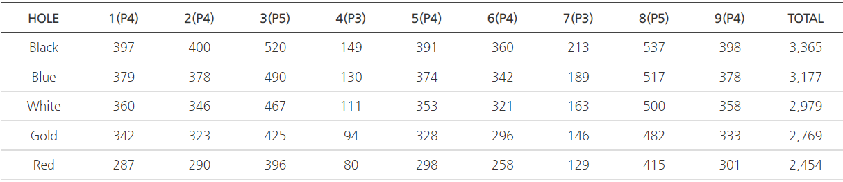 9개 홀 길이가 블랙 기준 3,725야드로 되어 있고 4번은 Par 5홀로서 11시 방향에 그린이 있어요. 정면에 해저드가 있어 드라이버를 너무 힘껏 치시면 위험할 수 있으니 살짝 우측을 보고 티샷 하는 것을 추천드려요. 6번은 Par 5홀로서 2시 방향에 그린이 있고 정면 벙커 왼쪽으로 티샷 하는 것이 좋아요.