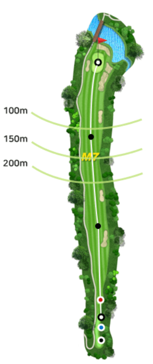 416m, Par 4홀로 홀 전체가 우측에서 좌측으로 경사가 있어요. 티샷에서는 앞에 해저드가 있고, 시야가 좁아 보여 위압감을 주는 홀로 티샷과 세컨샷 모두 약간 페어웨이 우측으로 공략하는 것이 좋아요.