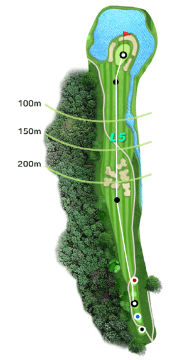 336m, Par 4홀로 4번 홀과 붙어있는 쌍둥이 홀이에요. 또한 긴 벙커를 중심으로 나누어져 있어요. 티샷은 30m를 내려치는 비교적 짧은 홀이지만 전방에 해저드가 있어 부담이 되고 장타자들은 우드티샷을 해야 해요.