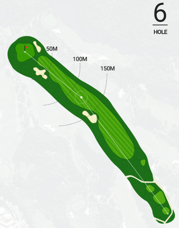 그린까지의 고도차가 심하며 전체 전장의 전방 130m까지 펼쳐진 워터해저드가 도사리고 있어 안정된 티샷이 요구되는 홀이에요. 그린 주변이 공간 여유가 없어서 좌, 우측으로 갈 경우 위험하기 때문에 그린 중앙을 공략하는 것이 좋아요.