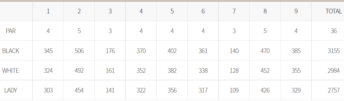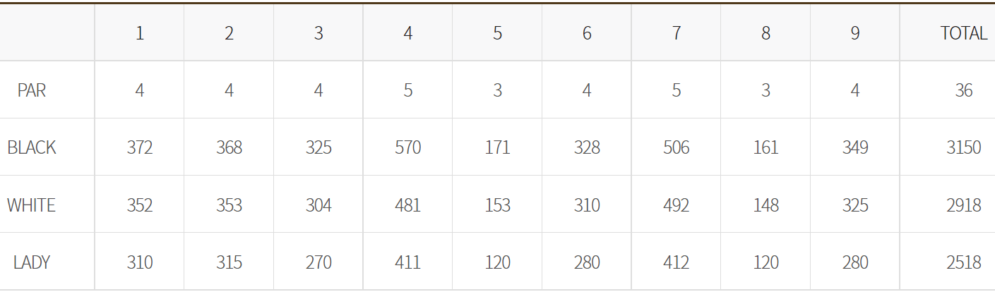 스카이밸리 cc 코스 중 회원제 코스인 스카이. 밸리 코스는 업다운과 언듈레이션이 적어 편안하고 차분한 분위기 속에서 깊은 분석을 가능하게 하여 정확도가 높은 여성적인 코스이고, 대중제 코스인 레이크. 마운틴 코스는 업다운과 언듈레이션이 커서 도전적인 느낌을 주지만 호쾌한 드라이버샷과 공격적인 전략을 요구하는 남성적인 코스예요.