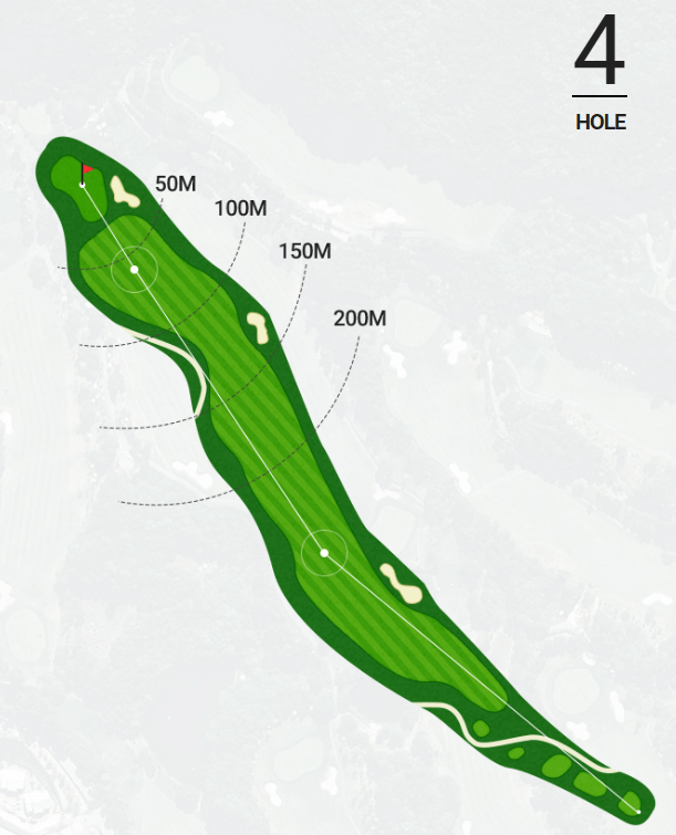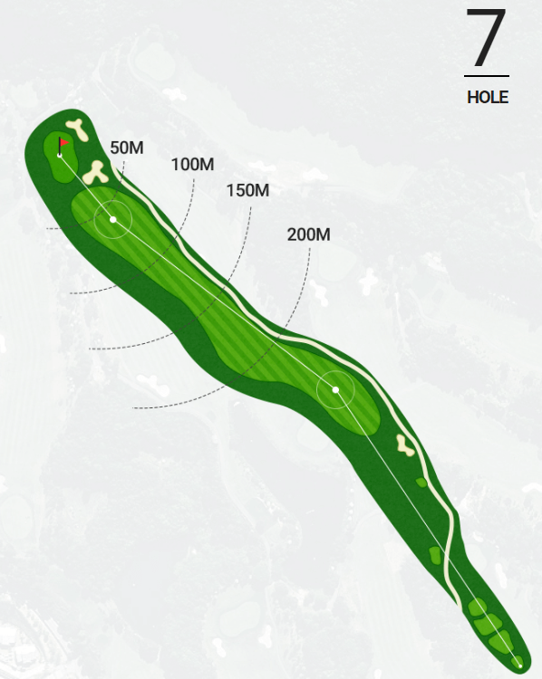 내리막 경사의 도전적인 승부홀로서 전체 전장의 약 120m까지 자연 계곡을 넘겨져야 하며 IP지점 좌측 자연림에 유의하여 페어웨이보다 우측으로 티샷 하는 것이 최선이에요. 세컨샷은 그린 우측으로 OB가 날 위험이 있어 유의해야 해요.