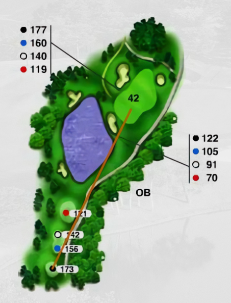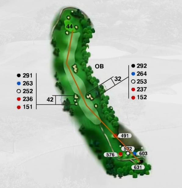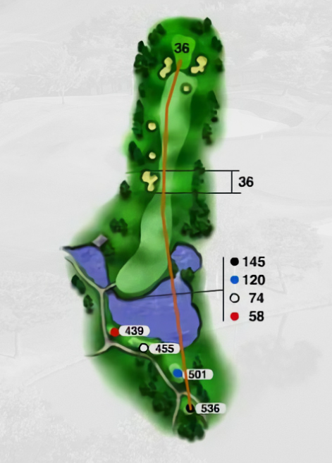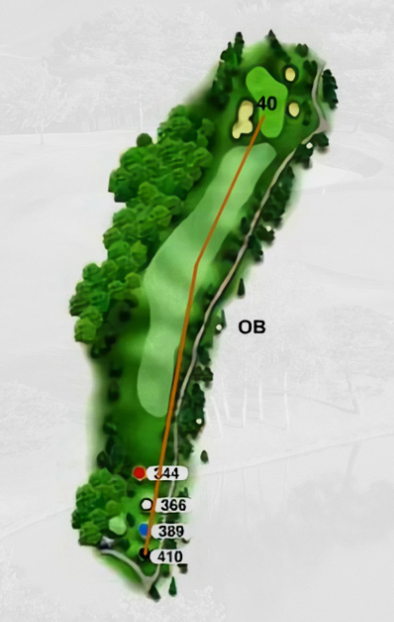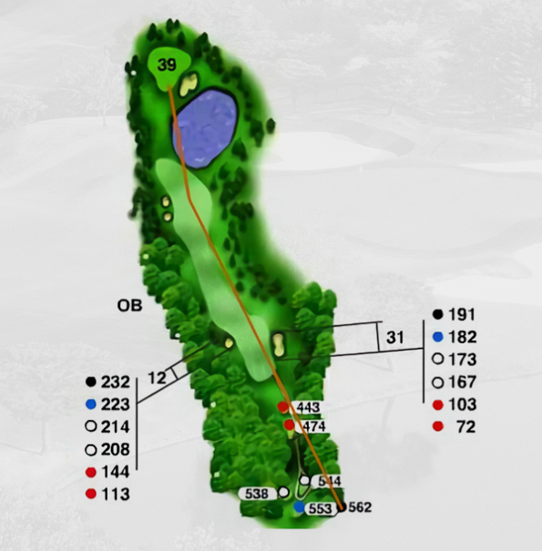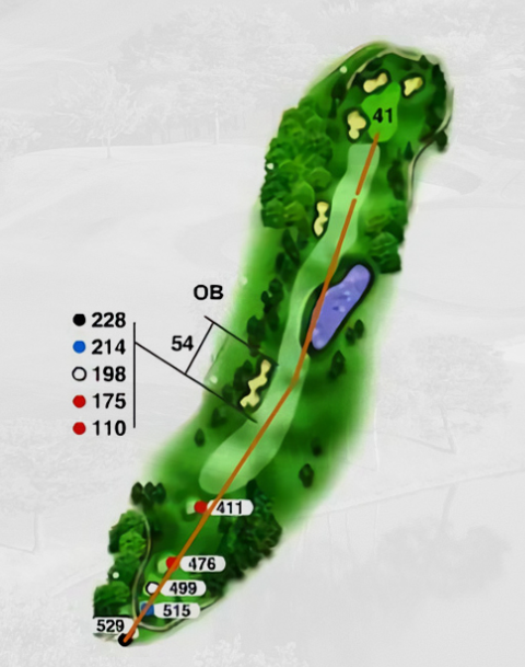티로부터 300야드 지점에서 시작되는 100야드 길이의 큰 연못으로 인해 드라이브 샷이 짧아지면 세컨드 샷이 어려워져요. 250야드 정도의 장타라면 2-On도 바라볼 수 있는 장타가 절대적으로 유리한 홀이에요.