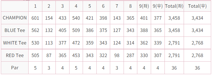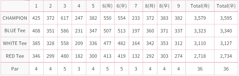 대영힐스 cc 력 코스는 9홀, Par 36, 블루티 기준 총 3,340m 전장이에요.