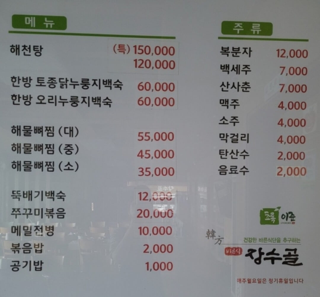 대영힐스 cc 근처 맛집 장수골은 대영힐스 cc에서 8분 거리에 위치해 있어요. 대표 메뉴는 해천당과 한방 토종닭 누룽지 백숙, 한방 오리 누룽지 백숙이 있고 그 외에 해물뼈찜, 뚝배기 백숙, 주꾸미 볶음 등이 있어요. 해천탕에는 토종닭, 백합, 새우, 가리비, 전복, 오징어, 문어, 홍합 등이 들어가는데 보기만 해도 몸보신이 절로 될 것 같은 비주얼이에요. 영업시간은 오전 10시~ 오후 9시까지이고 매주 월요일은 정기휴무예요.