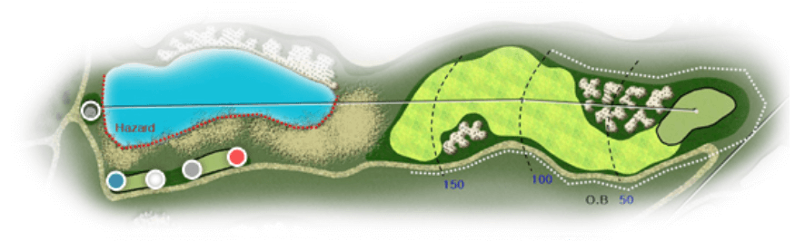 계곡을 향해 내려치는 Par 4홀로 탁 트인 시야와 내리막 경사가 첫 홀의 부담을 덜어줄 거예요. IP좌측 벙커는 Saving Bunker에요. 10시 방향인 그린은 레이크와 벙커로 Guard 되어 있어 Draw 구질의 2nd 샷이 유리해요. 다소 긴 2nd 샷의 거리는 내리막 경사와 완만한 Apron으로 인해 플레이어들에게 아이론을 잡을 수 있게 해 줘요.