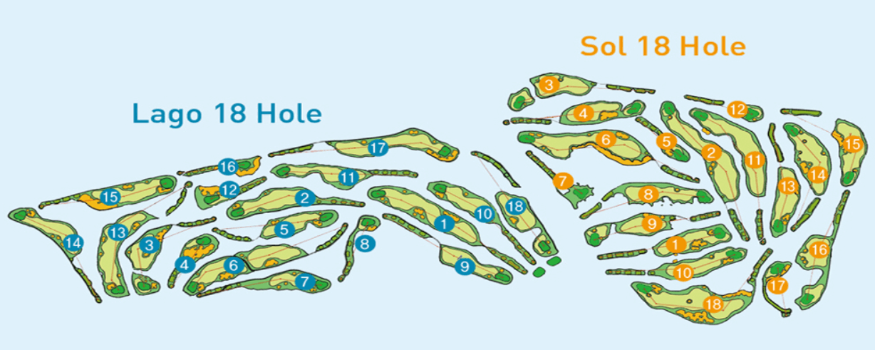 솔라고 cc 코스는 솔코스(IN, OUT 각 9홀) 18홀, 라고코스(IN, OUT 각 9홀) 18홀 총 36홀, Par 144, 총 13,307m 전장으로 되어 있어요.