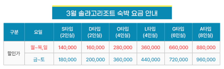 솔라고 cc 바로 옆에 솔라고 리조트가 있어요. 총 6가지 TYPE으로 최소 2인(TYPE S)부터 최대 10인(TYPE A)까지 이용할 수 있는 방이 있어요. 체크인 시간은 오후 3시, 체크아웃 시간은 오전 11시에요. 리조트 예약은 회원가입 후 예약 가능해요.