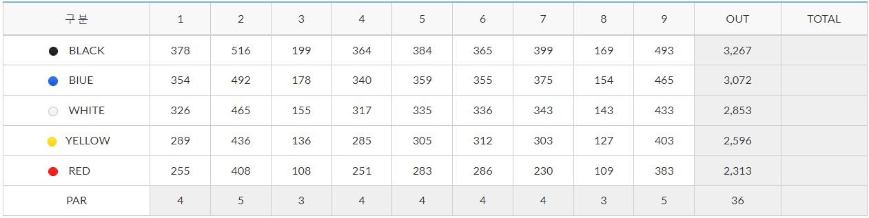 LAGO-OUT 코스는 9홀, Par 36, 블랙 티 기준 총 3,322m 전장이에요.